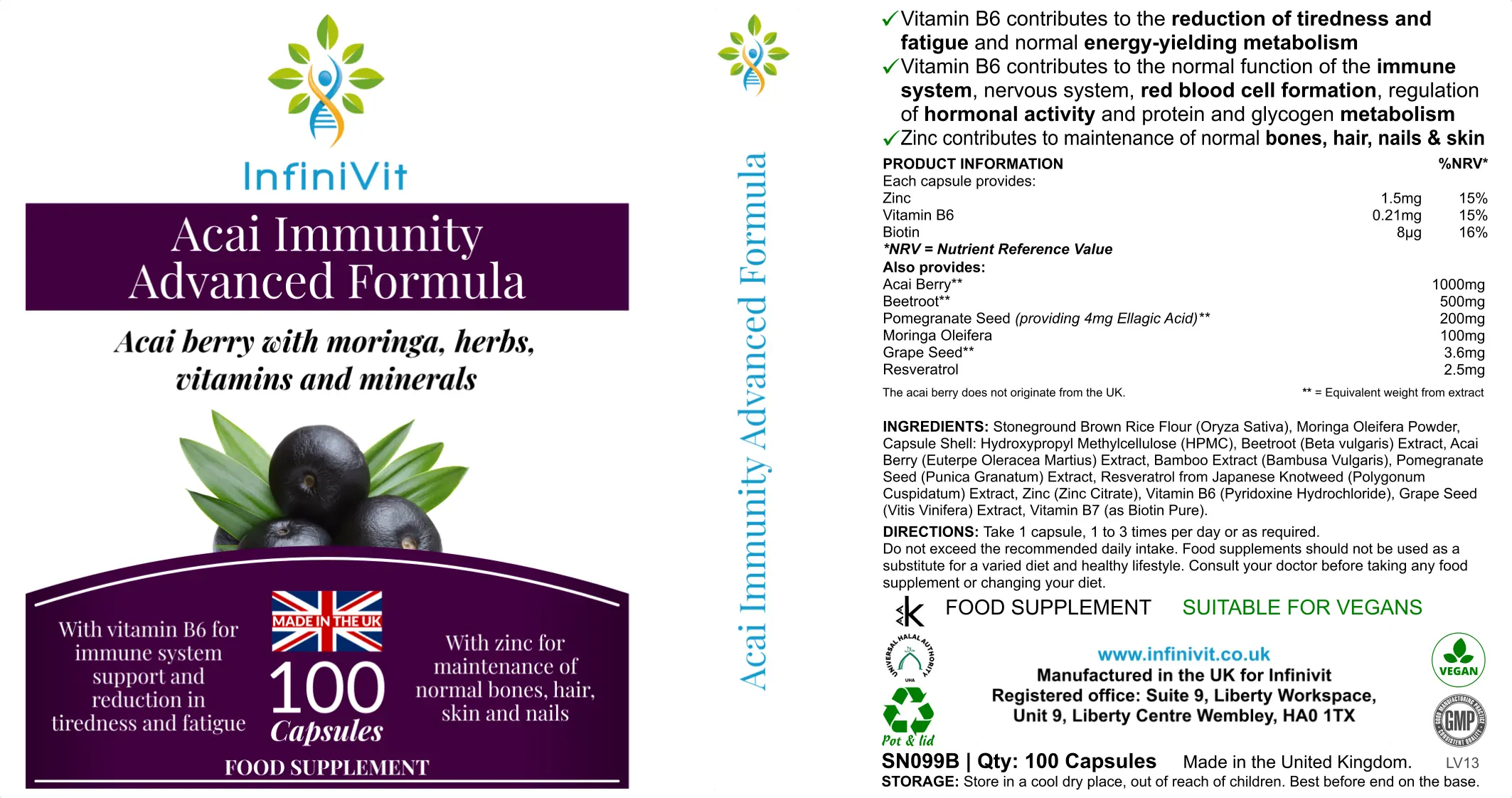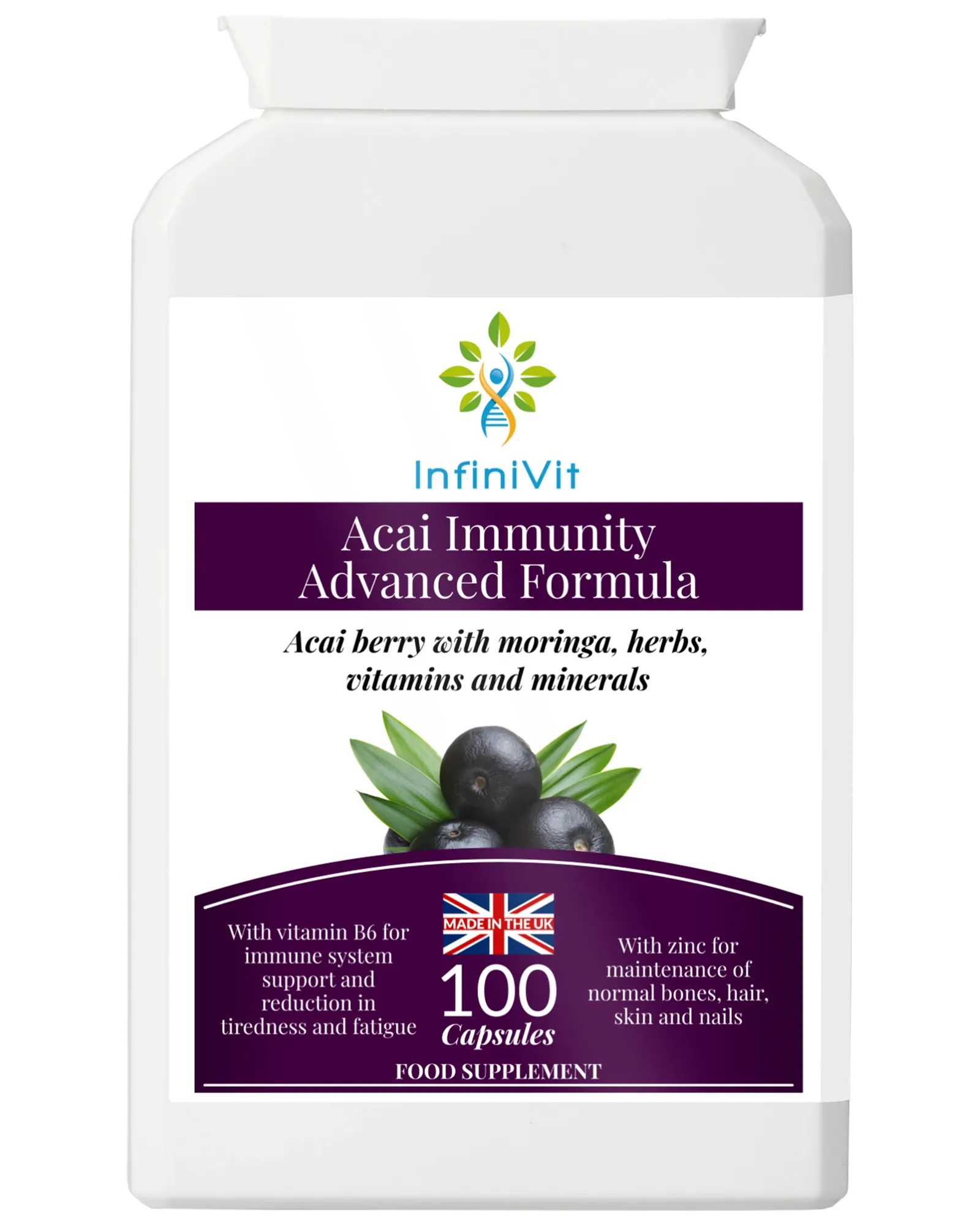 A high-potency formulation, which combines Brazilian freeze-dried acai berry powder and extract with a range of other beneficial ingredients, including vitamins, minerals and herbs (such as zinc, vitamin B6, biotin, organic Moringa Oleifera, beetroot and more) to provide support for immunity, energy, bones, hair, skin, nails and more.