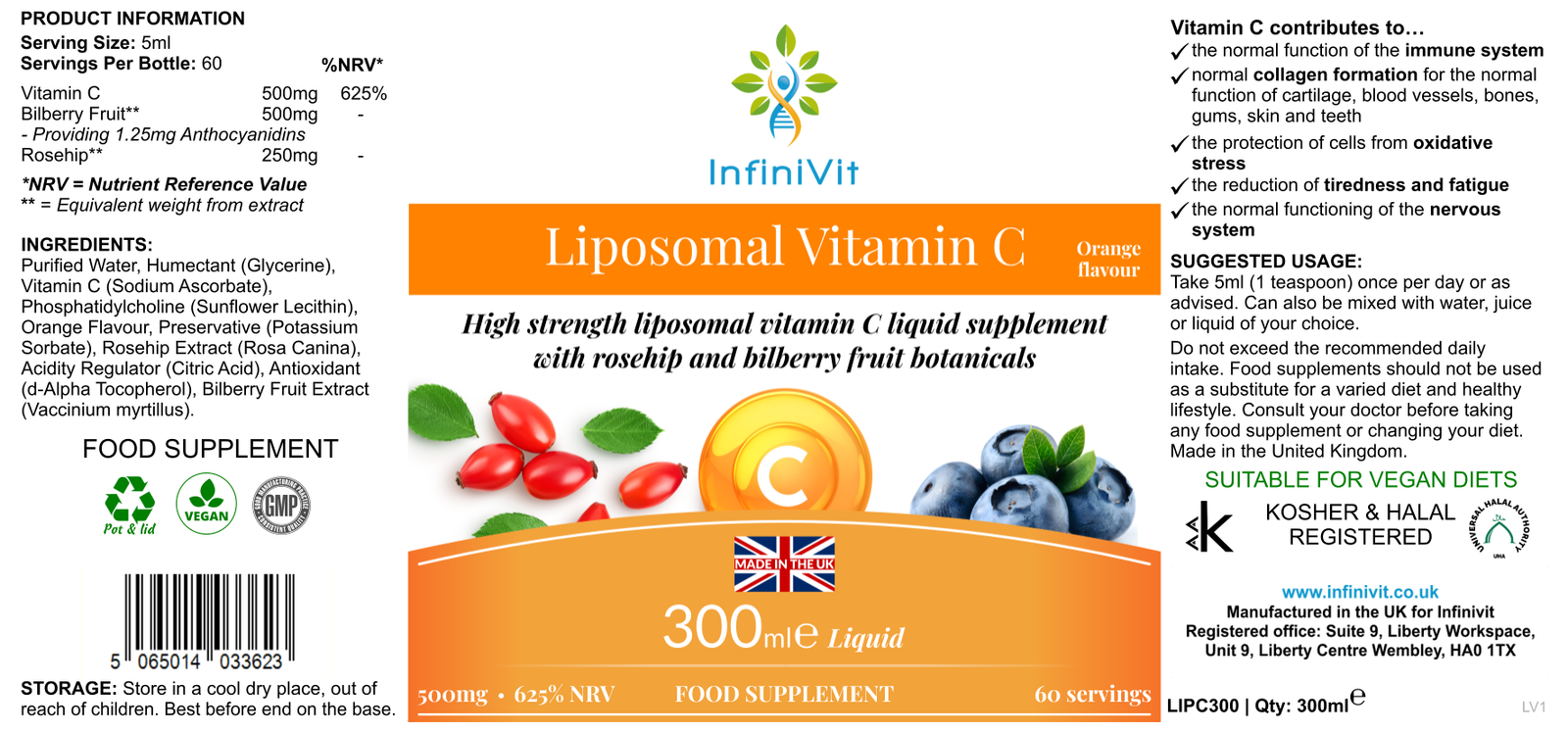 Purified Water, Humectant (Glycerine), Vitamin C (Sodium Ascorbate), Phosphatidylcholine (Sunflower Lecithin), Orange Flavour, Preservative (Potassium Sorbate), Rosehip Extract (Rosa Canina), Acidity Regulator (Citric Acid), Antioxidant (d-Alpha Tocopherol), Bilberry Fruit Extract